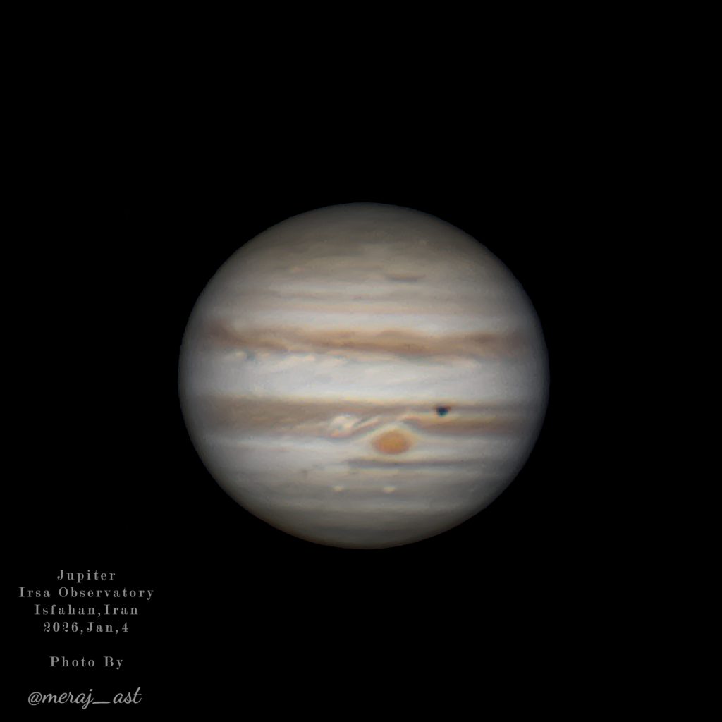 این نما توسط رصد خانه ایرسا ثبت شد، سیاره مشتری را در حالی می‌بینیم که دو پدیده جذاب را هم‌زمان به نمایش گذاشته است: