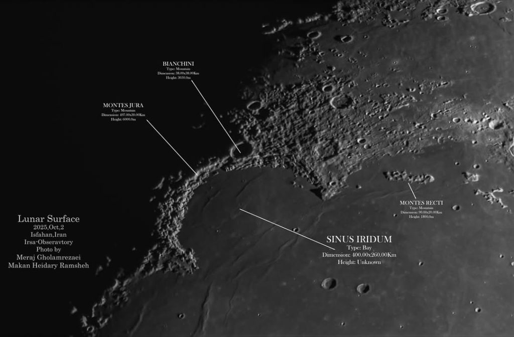 این نمای خیرهکننده، تصویری استثنایی از سینوس ایریدوم (Sinus Iridum)، یکی از زیباترین و برجستهترین عوارض سطح ماه، که به “خلیج رنگینکمان” معروف است.